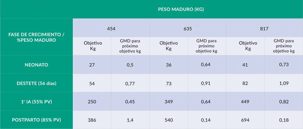 Tabla 1. Objetivos de peso, ganancia media diaria (GMD) y % del peso maduro en cada fase de la recría en función de distintos pesos vivos maduros (Dairy Calf & Heifer Association Gold Standards, 2016).